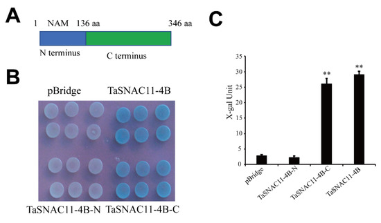 Transcriptional activity determination in yeast cells. (A) TaSNAC11-4B protein domain structure. (B) Yeast cells transformed with pBridge-TaSNAC11-4B-N, -TaSNAC11-4B-C, full-length TaSNAC11-4B, and empty vector, grown on SD-Trp-Ade media. (C) X-gal activity of yeast cells harboring different constructs as indicated. Asterisks indicate statistically significant differences (** p < 0.01) using a Student’s t-test. Three independent experiments were performed.