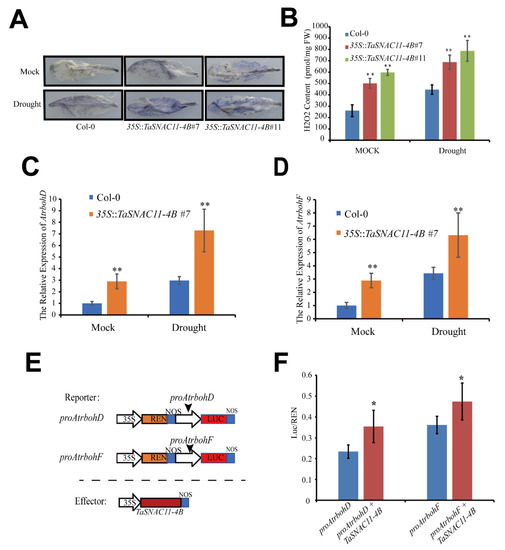 ROS are important signaling molecules in plants in response to a variety of stresses, as well as during senescence [58]. To investigate the role of TaSNAC11-4B in regulating ROS accumulation, the sixth leaves of Arabidopsis plants were detached and immersed in Nitro-blue tetrazolium (NBT) staining solution to visualize H2O2 levels. The results showed that leaves of TaSNAC11-4B overexpression lines displayed enhanced color compared with that of Col-0 (Figure 7A). The results from H2O2 quantification were consistent with the chemical staining data (Figure 7B), indicating that expression of TaSNAC11-4B promoted ROS accumulation in Arabidopsis leaves. The NADPH oxidase-mediated pathway has been shown to be the most prominent pathway in ROS production [59,60,61]. In Arabidopsis, two of the NADPH oxidase-encoding genes, Atrboh D and Atrboh F, have been shown to play key roles in ABA-mediated ROS production [45]. The results in this study demonstrated that TaSNAC11-4B functions in accelerating ABA- and stress-induced leaf senescence. Therefore, we tested whether AtrbohD and Atrboh F are related to the role of TaSNAC11-4B in promoting ROS production and leaf senescence. Interestingly, the qRT-PCR results showed that the transcripts of AtrbohD and AtrbohF were significantly up-regulated in TaSNAC11-4B overexpression lines compared to Col-0 under both normal and drought conditions (Figure 7C,D, Figure S5). Furthermore, we employed a dual-Luciferase assay in leaves of Nicotiana benthamiana to investigate the regulation of these Atrboh genes by TaSNAC11-4B. In the reporter constructs, the LUC gene was under the control of the AtrbohD or AtrbohF promoter. In the same construct, Renilla acts as a native control driven by the 35S promoter (Figure 7E). In the effector construct, TaSNAC11-4B was driven by the 35S promoter. As shown in Figure 7F, the LUC/REN ratio, as an indicator of direct transcription regulation, was significantly higher in reporter constructs co-transformed with the effector construct compared with the empty vector, suggesting that the TaSNAC11-4B transcription factor could directly regulate expression of the Atrboh genes.