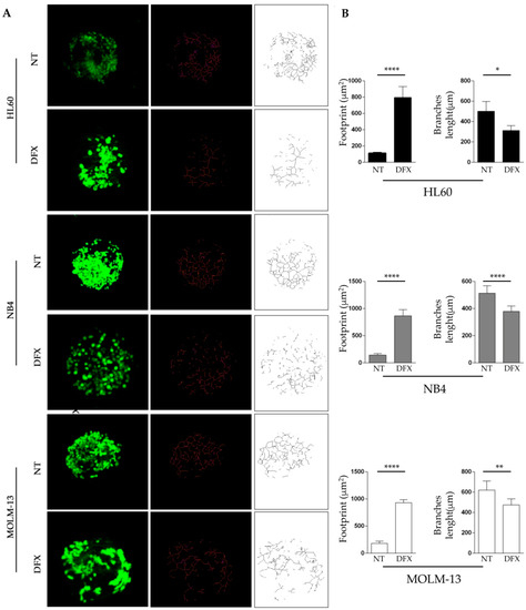 Figure 1. Iron chelation induces an altered network in acute myeloid leukemia cell lines. HL60, NB4, and MOLM-13 were treated for 48 h with 50 µM of DFX and subsequently incubated with 100 nM of MitoTracker green for mitochondrial network analysis. (A) The original green image obtained with confocal microscope is a three-dimensional (3D) image created with z-stack project (63× magnification). It has been processed using the MiNA toolset to generate an accurate skeleton. In red and black and white, the skeleton of mitochondria of the three cell lines treated with DFX is visible, compared to respective control. (B) Quantification of mitochondria footprint and branches length, which corresponds respectively to the area and connection, of mitochondria expressed in µm. Abbreviations: NT, not treated; DFX, Deferasirox. * p ≤ 0.05, ** p ≤ 0.01, and **** p ≤ 0.0001.