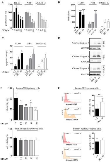 Figure 2. Deferasirox exerts an anti-leukemic activity on AML cell lines and on MDS patients’ cells. (A) HL60, NB4, and MOLM-13 were treated with 0, 10, 25, 50, or 100 μM DFX for 48 h and the MTT assay was performed to evaluate the proliferation index. The percentage of proliferation is expressed after normalizing with untreated cells (100%). (B) Mean fluorescence intensity (MFI) of FITC-calcein signal obtained after 48 h of DFX treatment. LIP level was inversely proportional to measured fluorescence intensity. (C) Percentage of apoptosis evaluated by flow cytometry after FITC Annexin-V assay on HL60, NB4, and MOLM-13 treated with 25 and 50 μM of DFX. (D) Western blot analysis of cleaved caspase 3 revealed that its amount increased in a DFX dose-dependent fashion, in HL60, NB4, and MOLM-13. (E) Five MDS/AML patients or 5 healthy subjects were treated with 10, 25, 50, or 100 μM of DFX for 48 h and the MTT assay was performed. (F) Representative histograms and % of apoptosis evaluated by flow cytometry after FITC Annexin-V assay on 5 MDS/AML patients or 5 healthy subjects treated with 50 μM of DFX. Abbreviations: NT, not treated; DFX, Deferasirox; Ann V, Annexin V. * p ≤ 0.05, ** p ≤ 0.01, and *** p ≤ 0.001.