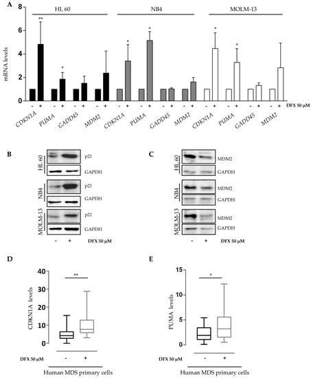 Figure 3. Deferasirox activates p53 targets on acute myeloid leukemia cell lines and MDS/AML patients. (A) CDKN1A, PUMA, GADD45, and MDM2 gene expression were assayed by qRT-PCR in HL60, NB4, and MOLM-13 after 48 h treatment with DFX 50 μM. The amount is expressed as fold changes compared to untreated cells after normalizing on the ABL housekeeping gene. (B,C) Western blot analysis of target proteins p21 and MDM2 after iron chelation treatment confirmed the effects of DFX on the p53 pathway. (D,E) CDKN1A and PUMA gene expression was assayed by qRT-PCR on 15 patients’ cells after 48 h in vitro treatment with DFX 50 μM. The mRNA quantity is expressed as 2−ΔΔCt after normalization with the ABL housekeeping gene. Abbreviations: -, not treated; + treated with DFX 50 μM; DFX, Deferasirox. * p ≤ 0.05, ** p ≤ 0.01.