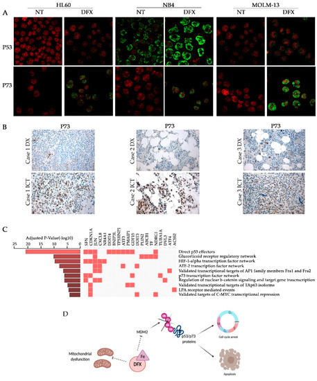 Figure 4. Deferasirox regulates p53 and p73 protein stability. (A) Immunofluorescence of p53 and p73 after DFX treatment. The green signal corresponds to p53 or p73 while the red propidium is used to detect nuclei (63× magnification). (B) p73 Immunohistochemistry on MDS bone marrow samples derived from 3 different patients at diagnosis (DX) and within one year of iron chelation treatment (ICT) (20× magnification). (C) Differentially expressed genes clusters enriched according to Gene Ontology terms and ordered by ascending adjusted p-value. (D) Schematic representation of the plausible role of iron chelation on mitochondrial activity and on p53 family stability (created in biorender.com). Abbreviations: NT, not treated; DFX, Deferasirox.