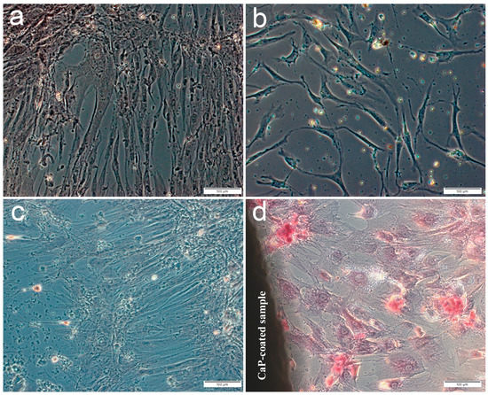 Culture of human adipose-derived mesenchymal stem cells on plastic after 14 (a,b) or 21 days (c,d) in a standard nutrient medium: a,c—control; b,d—around the microarc CaP-coated titanium sample. Staining with alizarin red S. Scale 100 µm