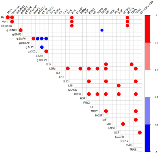 During the formation of a microarc CaP coating, its thickness, controlled by the technological parameters of the microarc device, determines the mass of CaP in the coating (r = 0.96; p <0.001; n = 7) and the average surface roughness index (Ra) (r = 0.96; p < 0.001; n = 7). The tested physical properties of the microarc CaP coating (thickness, mass, and roughness) in the 14-day hAMSC culture affected the secretion of IL-18 (r = 0.77–0.79; p < 0.01; n = 10) and SDF- 1α (CXCL12) (r = 0.69–0.73; p < 0.02; n = 10) (Figure 2).