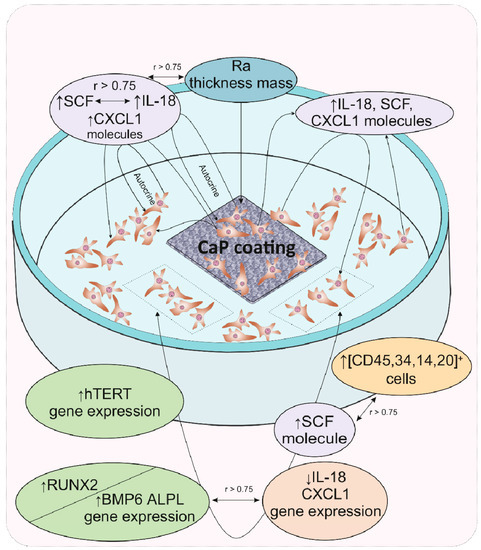 The results of cultural and correlation analyses in our model experiment showed that for hAMSCs, the 14th day of in vitro culture in contact with a rough microarc CaP coating is a checkpoint marking the end of the proinflammatory phase, the completion of hAMSC proliferation accompanied by the formation of three-dimensional MSC culture conditions, and the beginning of osteoblastic differentiation. The increasing secretion of pleiotropic inflammatory biomolecules by the feedback principle inhibits the expression of the corresponding genes, which may be the key step in an additional (relative to the already known) mechanism of initiating the expression of osteogenic genes. With the expanding network of cytokines and chemokines with osteomodulatory properties (IL-18, CXCL1), as well as the functions of signaling molecules in hematopoietic niches (e.g., SCF), HSC microterritories are established. According to correlation analysis, the described cellular-molecular changes may be induced by the properties of the microarc CaP coating (roughness, primarily for cells on the CaP surface), calcium and phosphorus ions secreted by the coating, and, to a greater extent, autocrine and paracrine cytokines/chemokines secreted by hAMSCs. A schematic representation summarizing our general results is shown in Figure 3.