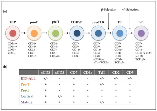 - Canté-Barrett, K.; Mendes, R.D.; Li, Y.; Vroegindeweij, E.; Pike-Overzet, K.; Wabeke, T.; Langerak, A.W.; Pieters, R.; Staal, F.J.T.; Meijerink, J.P.P. Loss of CD44dim expression from early progenitor cells marks T-cell lineage commitment in the human thymus. Front. Immunol. 2017, 8. [Google Scholar] [CrossRef] [PubMed]
