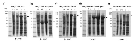 Expression and solubility profiles of VEEV nsP2 and nsP2pro-2. Samples represent the expression profile before (0 h) and after 4 h (4 h) or overnight (O/N) incubation of the non-permeabilized IPTG-induced cells, and the total (t) and soluble (s) protein fractions after cell permeabilization. (a) hexahistidine (His6)-VEEV nsP2, (b) His6-VEEV nsP2pro-2, (c) His6-maltose binding protein (MBP)-VEEV nsP2, and (d) His6-MBP-VEEV nsP2pro-2 were expressed at 30 °C, while (e) His6-MBP-VEEV nsP2 was expressed at 18 °C in E. coli Rozetta cells. Arrows show the recombinant proteins, the expected molecular weights are listed as follows. His6-VEEV nsP2: 91.7 kDa, His6-VEEV nsP2pro-2: 43.3 kDa, His6-MBP-VEEV nsP2: 131.3 kDa, and His6-MBP-VEEV nsP2pro-2: 83.0 kDa.