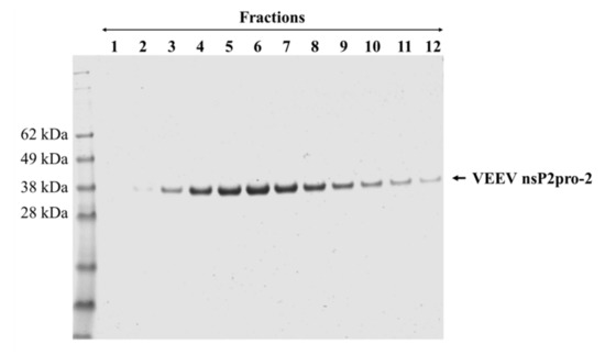 Purification of tag-removed VEEV nsP2pro-2 by gel filtration. The peak fractions (1–12) containing the protease were collected and analyzed by reducing SDS-PAGE. Fractions 2–12 were pooled and concentrated to 2.9 mg/mL final concentration. Arrow shows VEEV nsp2pro-2.