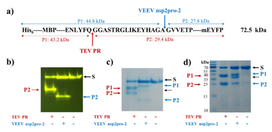 Cleavage of His6-MBP-EYHAGA↓GVVETP-monomeric enhanced yellow fluorescent protein (mEYFP) substrate. (a) The cleavage site sequence inserted into the His6-MBP-mEYFP substrate is shown. Cleavage positions of tobacco etch virus protease (TEV PR) and VEEV nsP2pro-2 are shown by red and blue arrows, respectively. Calculated molecular weights of cleavage fragments (P1 and P2) are also indicated. Cleavage reactions were followed by electrophoretic analysis of mixtures using native (b,c) or reducing conditions (d). The bands were detected in the gels by blue light trans-illumination (b) and by Coomassie staining (c,d). Black dashed arrows show the band of VEEV nsP2pro-2.