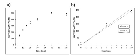 Time-course kinetic measurements of VEEV nsP2pro-2. (a) The amount of the GVVETP-mEYFP generated from wild-type His6-MBP-EYHAGA↓GVVETP-mEYFP (at a 21.2-µM final concentration) by VEEV nsP2pro-2 (at a 3.0-µM final total concentration) is plotted as a function of time. In the graphs, results of two independent experiments are plotted and the points of datasets are shown by full and open circles. (b) The 0–10 min timeframe of figure part (a) is enlarged, in this timeframe the enzyme activity was considered to be linear with time. For datasets which are shown by full and open circles the regression lines are indicated by a continuous and a dotted line, respectively.