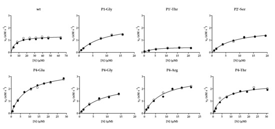 The results regarding the studied P5, P4, P2, P1, P1′, and P2′ variants are discussed as follows, including investigation of enzyme–substrate interactions, the results of in silico calculations and their correlation with in vitro measurements, as well.