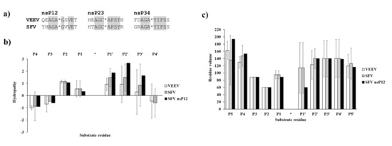 The nsP23 and nsP34 alphaviral (VEEV, EEEV, WEEV, SFV, CHIKV, and SINV) cleavage sites contain hydrophobic/non-polar residues (Pro, Leu, Ile, Val) in P2′ position, while the polar Ser can be found in nsP12 cleavage sites of VEEV, EEEV, and WEEV (QEAGA↓GSVET).