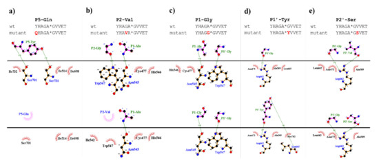 Comparison of interaction maps for wild-type and some mutant substrates. The mutant complexes were prepared using DynaMut web server. Upper parts of the figures show interactions for the wild-type substrates, while bottom parts for the P5-Gln (a), P2-Val (b), P1-Gly (c), P1′-Tyr (d), and P2′-Ser (e) mutants. Figures were prepared by plotting protein–protein interactions using DIMPLOT module of LigPlot+ v2.1.