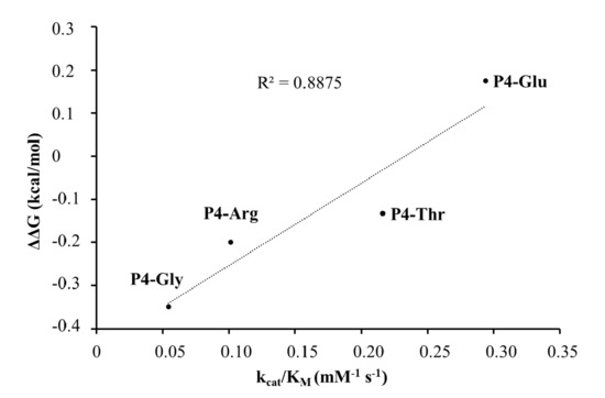 In the case of the studied P4 variants, the predicted changes of free energy showed good correlation with the in vitro obtained kcat/KM values (Figure 10).