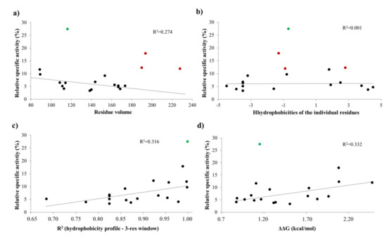 Dependence of activity on different cleavage site features. The relative activities were plotted as a function of the volume (a) and hydrophobicity of each individual P1′ residue (b), the overall hydrophobicity of the cleavage site (c), and the ΔΔG value calculated for all P1′ mutant (d). Values obtained for the wild-type substrate (P1′-Gly) were not plotted (relative specific activity: 100%). The values that were used for the correlation are shown by black dots, and those values which were excluded from the linear regression are colored as follows: green, P1′-Thr; red, P1′-Tyr, P1′-Trp, and P1′-Phe.