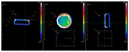 Exemplary µ-PET image of two dishes of one donor. Upper row of the dish was treated using osteogenic medium, while the lower row the dish was treated with control media. Blue and green outlines (indicated by white arrows) defining the regions of interest around the two dishes in axial, coronary and sagittal views.