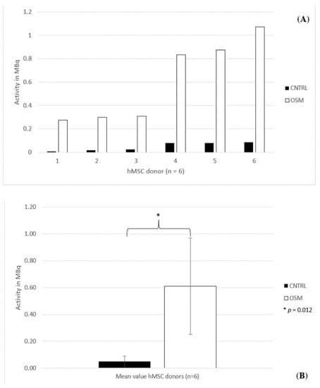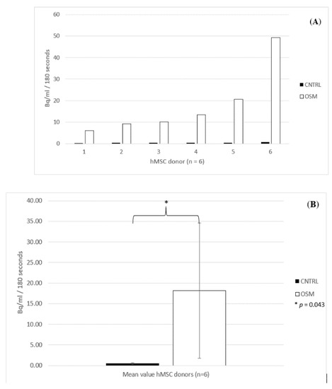 The highest uptake within the six dishes treated with OSM was 49.3 Bq, while the lowest activity was still 6.1 Bq, reflecting the individual osteogenic potential of the donors. The mean activity within the OSM group was 18.15 Bq, with a standard deviation of 16.03 Bq and a standard error of the mean of 6.5 Bq. Within the OSM group, three donors showed a particularly higher uptake (49.3; 20.6; 13.4 Bq) compared to the three remaining donors (10.2; 9.3; 6.1 Bq). Nevertheless, even the donor with the lowest uptake within the OSM group (6.1 Bq) still had a 7.6-fold higher uptake than the donor with the highest uptake within the CNTRL group (0.8 Bq).
