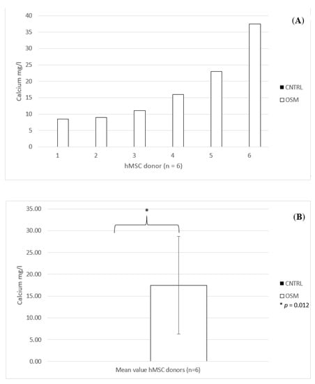Quantification of the calcium concentration of the monolayer cultures by inductively coupled plasma mass spectrometry (ICP-MS) likewise showed impressive results. Within the OSM group, the calcium concentration exhibited a certain variability (mean concentration 17.5 mg/L, standard deviation 11.20 mg/L, standard error of the mean 4.57 mg/L). The highest concentration was 37.5 mg/L and the lowest 8.5 mg/L. No relevant calcium concentration was detected in any of the CNTRL group samples: the concentration was 0 mg/L in all six samples (Figure 3A,B).