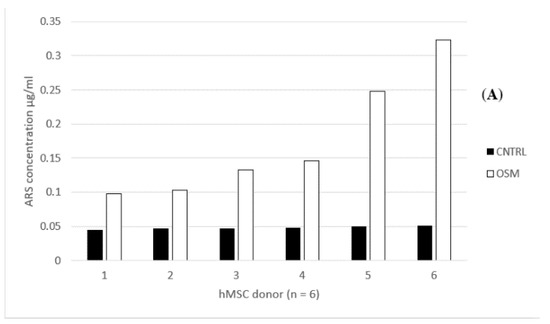 One dish from each group (OSM, CNTRL) and donor (n = 6) was used. The 35-mm dishes were fixed with 2.5 mL 70% ethanol (−20 °C) for 4 min followed by washing with aqua dest. The staining solution was prepared by dissolving 0.5 g Alizarin Red S powder (Sigma-Aldrich A5533, Taufkirchen, Germany) in 100 mL aqua dest. The pH was adjusted by adding ammonium hydroxide (Sigma-Aldrich, Taufkirchen, Germany) until a pH of 7.2 was obtained, then 1 mL of staining solution was added to each dish. The dishes were incubated at room temperature for 10 min followed by repeated (5×) washing with 1 mL aqua dest. Next, 1 mL of a 10% (w/v) cetylpyridiniumchloride (Sigma-Aldrich, Saint Louis, MO, USA) solution dissolved in 10 mM sodium phosphate (Sigma-Aldrich, Taufkirchen, Germany) was added to each dish. After a new incubation for 10 min at room temperature on a shaker, 20 µL from each sample was placed in a 96-well plate and 180 µL of the 10% (w/v) cetylpyridiniumchloride (Sigma-Aldrich, Saint Louis, MO, USA) solution was added. In parallel, a standard dilution with Alizarin Red concentrations between 62.5–0.01 µg/mL was prepared in the same 96-well plate. Photometric absorption was determined at 570 nm in a 96-well plate reader, followed by plotting a standard curve with the results of the standard dilution. The absorption values of the samples were transferred into Alizarin Red concentration by referring to the standard curve.