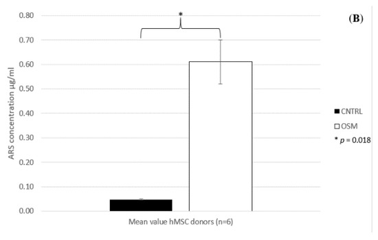 Within the OSM group, the mean ARS concentration was 1.24 µg/mL (standard deviation 0.819 µg/mL, standard error of the mean 0.334 µg/mL). The highest concentration within that group was 2.58 µg/mL, while the lowest concentration was 0.54 µg/mL. In contrast, within the CNTRL group, the highest uptake was 0.12 µg/mL while the lowest concentration was 0.06 µg/mL. The mean concentration was 0.09 µg/mL (standard deviation 0.021 µg/mL, standard error of the mean 0.008 µg/mL) (Figure 5A,B).