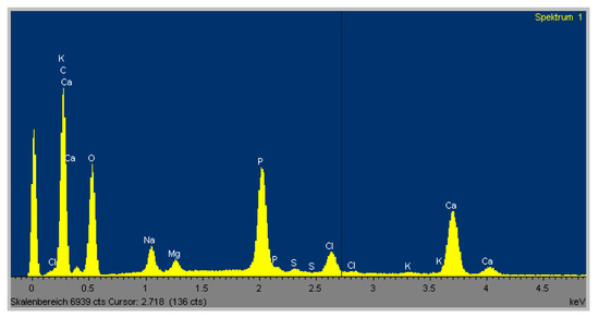 The EDX analysis of the elements revealed calcium was not present within the CNTRL group, although traces of phosphorus were detected. However, within the OSM group, there was a strong signal for the presence of calcium as well as for phosphorus. This corresponded with the SEM images, which showed multiple spots of a crystalline structure at 500× magnification within the OSM group. At the same magnification, no comparable structure was found within the CNTRL group (Figure 6 and Figure 7).