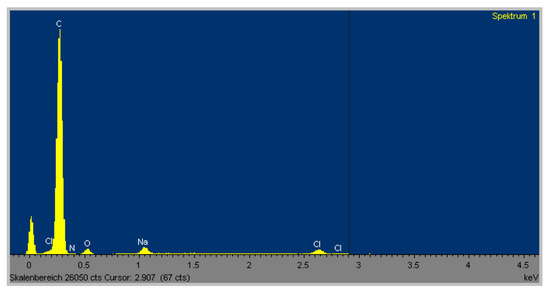 Energy dispersive X-ray microanalysis (EDX) spectrum of an exemplary dish from the negative control group showing no presence of calcium or phosphorus. The high carbon peak is due to the carbon sputtering as demanded for proper EDX scanning.