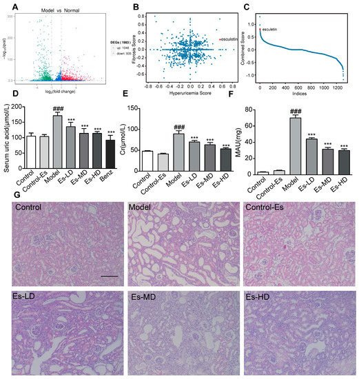 Connectivity map analysis and the effects of Esculetin on HUA with HN. (A) Scatter plot of the enrichment scores of HUA and fibrosis. Each dot represents an individual small molecule. Esculetin had a high HUA and positive fibrosis score. (B) Sum of the HUA and fibrosis scores. Esculetin had the 4th greatest score amongst the small molecules. X axis: individual small molecules. (C) The y-axis is the sum of Hyperuricemia Score and Fibrosis Score. The x-axis is the molecules sorted from high to low according to the Combined Score. (D) Serum UA levels in HUA model mice. (E) Serum creatinine levels. (F) Urine microalbumin. Vertical bars show data with mean ± SD (n = 6). ### p < 0.001 vs. Control. *** p < 0.001 vs. Model. (G) Photomicrographs of HE stained kidney tissues of HUA model mice (magnification 200×).