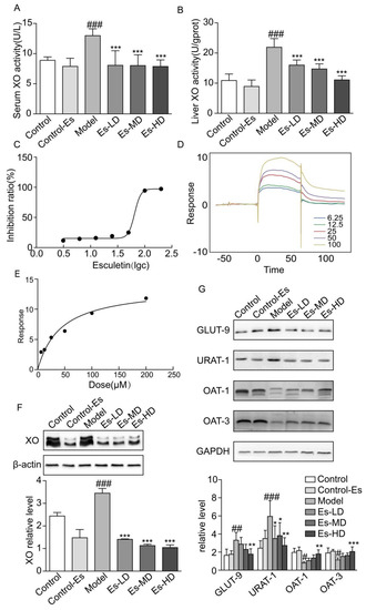 The homeostasis of SUA is mainly governed by hepatic production and renal excretion. XO is the rate-limiting enzyme during purine metabolism [21]. We therefore investigated the potential of esculetin as an effective XO inhibitor. In in vivo experiments, esculetin could inhibit the expression and activity of liver XO in HUA mice. In in vitro experiments, SPR suggested that esculetin could bind XO directly in a concentration-dependent manner (Figure 2D,E). The IC50 of esculetin on XO in vitro was 64.93 µM.