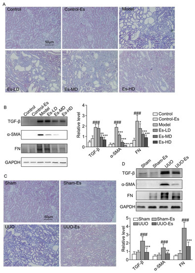 As predicted by CMAP, esculetin could reduce fibrosis (cs score = −0.243). To confirm this effect, we examined the fibrotic markers TGF-β1, α-SMA and FN. Each marker was upregulated by 3.8-, 10-, and 10-fold respectively in HUA mice, and reduced to normal levels by esculetin (Figure 3B). Masson’s trichrome staining demonstrated collagen accumulation and severe morphologic lesions in HUA kidneys (Figure 3A). Treatment with esculetin reduced these phenotypes. In 7-day UUO models, similar trends were observed for TGF-β1, α-SMA, and FN following Masson’s trichrome staining (Figure 3C,D).