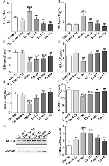 Effects of esculetin on oxidative stress levels in HUA model mice. (A) Serum H2O2 levels. Vertical bars show data with mean ± SD (n = 6) (B) MDA activity in renal tissue. Vertical bars show data with mean ± SD (n = 6) (C) GSH levels in renal tissue. Vertical bars show data with mean ± SD (n = 6) (D) GPx activity in renal tissue. Vertical bars show data with mean ± SD (n = 6) (E) SOD activity in renal tissue. Vertical bars show data with mean ± SD (n = 6) (F) Mn-SOD activity in renal tissue. Vertical bars show data with mean ± SD (n = 6). n.s., not significant. ## p < 0.01 and ### p < 0.001 vs. Control. ** p < 0.01 and *** p < 0.001 vs. Model. (G). Expression of Nox-4 in the kidney was determined by western blot analysis. Vertical bars show data with mean ± SD (n = 5). n.s., not significant. ### p < 0.001 vs. Control. ** p < 0.01 vs. Model.