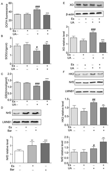 Effects of esculetin on the nuclear translocation of Nrf2 and HK2. (A) DCFDA fluorescence. Vertical bars show data with mean ± SD (n = 6) (B) Effects of esculetin on cellular SOD activity. Vertical bars show data with mean ± SD (n = 6) (C) Effects of esculetin on cellular GSH levels. Vertical bars show data with mean ± SD (n = 6). # p < 0.05, ### p < 0.001 vs. untreated group. ** p < 0.01 and *** p < 0.001 compared to UA only. (D) Effects of esculetin on nuclear Nrf2 accumulation in NRK-52E cells. Nuclear Nrf2 was determined by Western blot analysis. Vertical bars show data with mean ± SD (n = 5). ** p < 0.01 and *** p < 0.001 vs. untreated group. (E). Western blots of XO in HepG2 cells following UA irritation ± esculetin treatment. (F) Western blots of Nrf2 and HK2 in nuclear fractions from HepG2 cells. Vertical bars show data with mean ± SD (n = 5). # p < 0.05, ## p < 0.01, ### p < 0.001 vs. untreated group. * p < 0.05, ** p < 0.01 and *** p <0.001 compared with UA treated group.