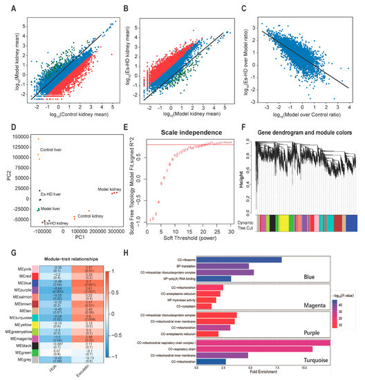 RNA-seq analysis reveals transcriptional reversion by esculetin in the kidney. (A) Scatter plots of the gene expression in Model vs. Control groups. Black line: y = x line. (B). Scatter plots of gene expression in Es-HD versus Model groups. Red (green) dots show genes that were down- (up-) regulated by 100 fold (A) which were revered after esculetin treatment (B) Black line: y = x line. (C) Scatter plots of gene expression in Model vs. Controls and Es-HD vs. Model ratios in the log10 scale. Changes in the ratios indicated a perfect restoration. (D) PCA analysis of 18 samples using absolute gene expression data in the kidney and liver. The distance between different dots indicates their similarity. (E) x-axis: different power value; y-axis: r-square value after linear regression of -log10 (k) and log10 (p (k)). K: connectivity of the gene nodes; p (k): possibility of such a node. Horizontal line: 0.8. (F) The result of gene clustering. Different colors show different gene modules. (G) Gene modules and phenotypes quantified using the Boolean variable (1 represents occurrence, 0 represents no occurrence) were used to calculate the correlation coefficient, which is demonstrated as a heat map. p-values are shown in brackets. (H) The results of GO analysis in blue, magenta, purple, and turquoise modules. Among them, “BP” stands for biological process, “CC” stands for cell component, and “MF” stands for molecular function.