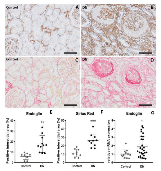 Endoglin expression is increased in the interstitium in biopsies of patients with DN. Representative images of endoglin staining (A,B) and Sirius Red staining (C,D) in kidney biopsies from non-diabetic controls (A,C) and patients with DN (B,D). Summary data for the endoglin-positive area (E) and Sirius Red‒positive area (F) are also shown. (G) mRNA expression levels of endoglin in whole kidney lysates derived from biopsies of patients with DN. The housekeeping gene HPRT was used as a control. * p < 0.05, ** p < 001 and *** p < 0.001 (Student’s t-test). The scale bars represent 50 µm.