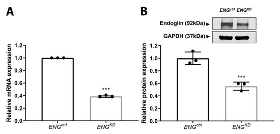 shRNA-mediated knockdown of endoglin expression in TK173 fibroblasts. (A) ENG mRNA levels were measured in TK173 cells expressing an empty vector control (ENGctrl) and TK173 cells expressing an shRNA against ENG (ENGKD); data are depicted relative to ENGctrl cells. (B) Western blot analysis of endoglin protein levels in ENGctrl and ENGKD fibroblasts. GAPDH was used as a loading control. Data are shown relative to ENGctrl cells. Data are presented as the mean ± SD from three experiments. *** p < 0.001 (Student’s t-test).