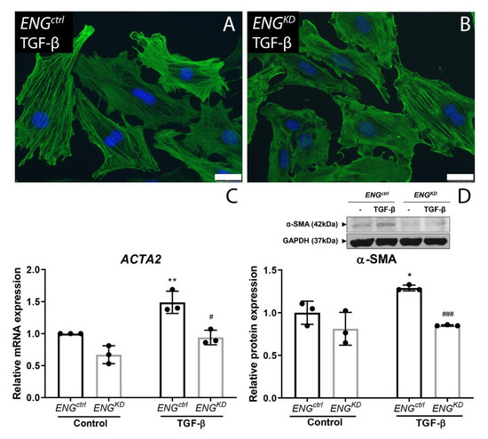 We performed an α-SMA staining on fibroblasts cultured on coverslips. The intensity of the α-SMA staining seemed to be slightly lower in the ENGKD compared to the ENGctrl cells (Figure 5A,B). To quantitatively assess changes in α-SMA, mRNA and protein levels were analyzed. To this end, ENGKD and ENGctrl fibroblasts were stimulated with TGF-β1, and gene expression of ACTA2 (which encodes α-SMA) and α-SMA protein were measured using qPCR and western blot analysis, respectively. TGF-β1 significantly increased both ACTA2 mRNA and α-SMA protein levels in ENGctrl fibroblasts. In contrast, TGF-β1 had no significant effect on either ACTA2 mRNA or α-SMA protein levels in ENGKD fibroblasts (Figure 5C,D).
