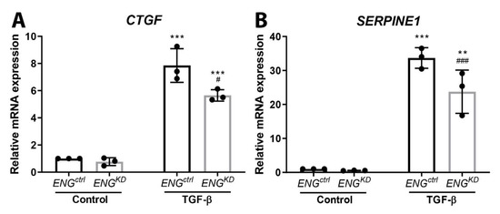 ENGKD fibroblasts have reduced TGF-β-induced upregulation of pro-fibrotic TGF-β downstream target genes. ENGctrl and ENGKD fibroblasts were incubated with 5 ng/mL TGF-β1 for 24 h, after which CTGF (A) and SERPINE1 (B) mRNA levels were measured using qPCR. The housekeeping gene HPRT was amplified as a control, and each mRNA level is plotted relative to the respective unstimulated (control) ENGctrl group. mRNA levels are plotted relative to unstimulated (control) ENGcrtl fibroblasts, and summary data are presented as the mean ± SD from three experiments. ** p < 0.01 and *** p < 0.001 versus unstimulated fibroblasts from the same cell line (Student’s t-test); # p < 0.05 and ### p < 0.001 ENGctrl versus stimulated ENGKD fibroblasts (Student’s t-test).