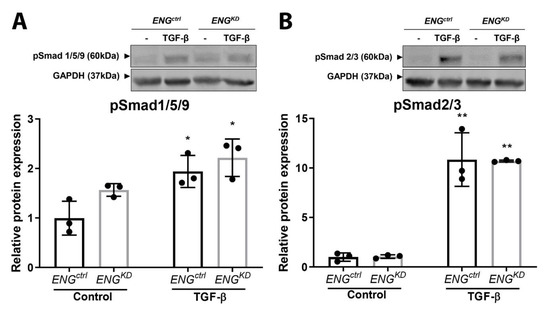 TGF-β-induced Smad1/5/9 and Smad2/3 phosphorylation is similar in ENGKD and ENGctrl fibroblasts. ENGctrl and ENGKD fibroblasts were incubated with 5 ng/mL TGF-β1 for 1 h, after which pSmad1/5/9 (A) and pSmad2/3 (B) were measured using western blot analysis. GAPDH was used as a loading control. The lower graphs show the quantification of the western blot data. pSmad protein levels were plotted relative to unstimulated ENGctrl fibroblasts, and summary data are presented as the mean ± SD from three experiments. * p < 0.05 and ** p < 0.01 versus unstimulated fibroblasts from the same cell line. (Student’s t-test).