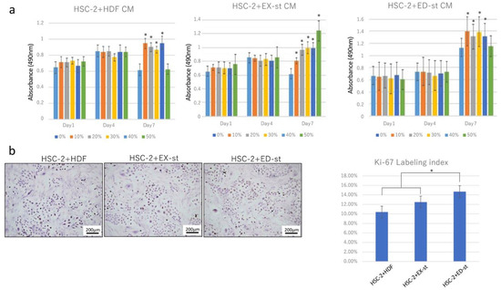 To investigate the effect of tumor stroma on HSC-2 proliferation, the growth ability of HSC-2 was measured added to the stromal CM. On culture days 3 and 5, no difference was seen in cell proliferation between the control group and the groups to which HDF CM, ED-st CM, and EX-st CM was added. On culture day 7, the cell proliferation of all samples to which stromal CM had been added was higher than that of the control group (Figure 2a).