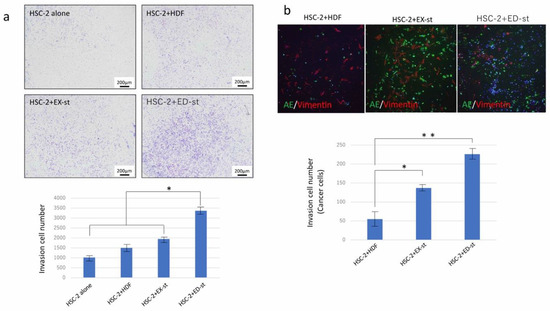 The tumor stroma promoted the invasive ability of HSC-2 cells in vitro. (a) Representative light microscopic images showing stained tumor stroma/HDFs and HSC-2 cells on the lower surface of the microporous transwell insert after invasion. The invasive ability of HSC-2 cells was strongly promoted when co-cultured with stromal cells compared to HDFs. ED-st in particular most strongly promoted the invasive ability of HSC-2 cells. n = 4. (b) Representative images of immunofluorescence staining of invading cells with vimentin (red) and α-SMA (green) staining and DAPI counterstaining (blue). The tumor stroma promoted the invasive ability of HSC-2 cells compared to HDFs, and ED-st most strongly increased the invasive ability of HSC-2 cells. n = 4, * p < 0.05, ** p < 0.01.