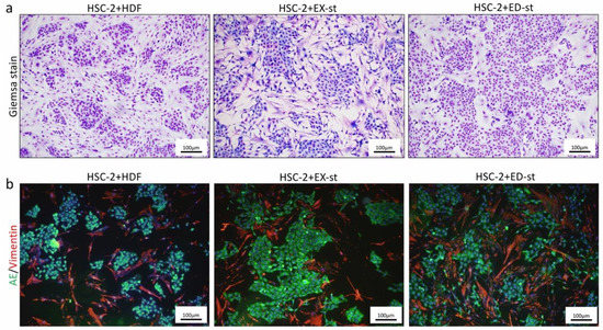 Representative images and immunofluorescent staining of 2D co-culture with HSC-2 cells and various types of stroma. (a) In the HSC-2/HDF co-culture group, cancer cells forming very small masses were observed. In the HSC-2/EX-st co-culture group, large cancer nests were observed. In the HSC-2/ED-st co-culture group, relatively small cancer nests were formed. (b) Immunofluorescent staining with vimentin (red) and AE1/3 (green) and DAPI counterstaining (blue). In the HSC-2/HDF co-culture group, a small number of small tumor nests with weak adhesion between tumor cells was observed, and the growth of the tumor stroma was also loose. In the HSC-s/EX-st group, tumor cells formed large tumor nests, the stromal cells showed dendritic or spindle-shaped morphology, and the stroma showed dense growth in some areas. In the HSC-s/ED-st group, vigorous growth of small tumor nests was observed, and dense dendritic tumor stromal cells were observed.