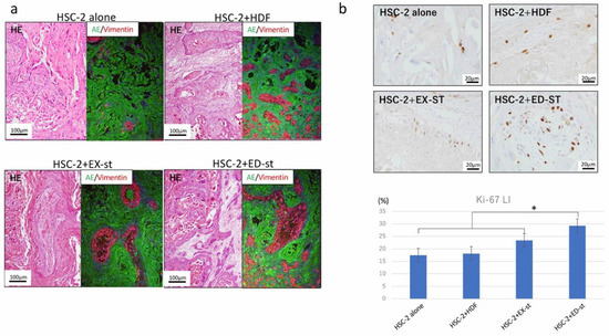 The Ki-67 labeling index in both the HSC-2/ED-st and HSC-2/EX-st groups was significantly higher than that of the HSC-2 alone group and the HSC-2/HDF group (Figure 5b).