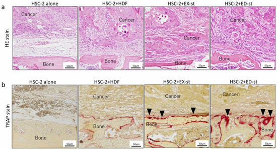 To investigate bone destruction by osteoclasts, TRAP staining was carried out in the tumor-implanted mouse model. The number of multinucleated giant cells in the bone resorption area was higher in the HSC-2/ED-st group than in the HSC-2/EX-st group. In the HSC-2/HDF group, bone resorption was hardly observed (Figure 6b).