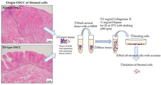 The method of isolation of stromal cells is illustrated in Figure 7. Preparation of primary cultured stroma from human OSCC tissues was performed. The stromal cells samples were obtained from surgical operative tissues in the Oral Surgery Department of Okayama University. This study was approved by the Ethics Committee of Okayama University (the project identification code: 1703-042-001). In addition, we obtained informed consent from all patients. Pieces of fresh oral squamous carcinoma tissue (1 mm3) were washed several times with Alpha-MEM (Life Technologies, Thermo Fisher Scientific Inc.) containing antibiotic–antimycotic (Life Technologies, Thermo Fisher Scientific Inc.) and then minced. These tissues were treated with Alpha-MEM containing 1 mg/mL collagenase II (Invitrogen Co., New York, NY, USA) and Dispase (Invitrogen Co., New York, NY, USA) for 2 h at 37 °C with shaking (200 rpm). The released cells were centrifuged for 5 min at 1000 rpm, suspended in Alpha-MEM containing 10% FBS (Biowest, Nuaillé, France), filtered using a Cell strainer (100 μm, BD Falcon: BD Bioscience, Primus, UK), plated in a tissue culture flask, and incubated at 37 °C in 5% CO2. One week later, stromal cells were obtained following treatment with Accutase (Invitrogen Co.) based on the different adhesion of epithelial and stromal cells. We named these stromal cells ED-st (derived from ED-type OSCC stroma) and EX-st (derived from EX-type OSCC stroma). In this experiment, human dermal fibroblasts (HDFs) purchased from LONZA (Tokyo, Japan) were used as a control for the tumor stroma. These stromal cells and HDFs were maintained in Alpha-MEM containing 10% FBS and were used within 10 passages to eliminate transformation due to passaging.
