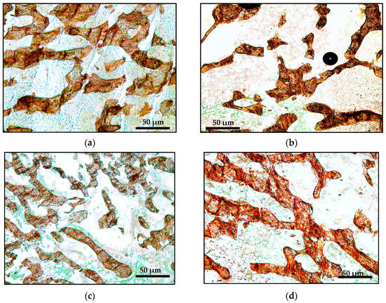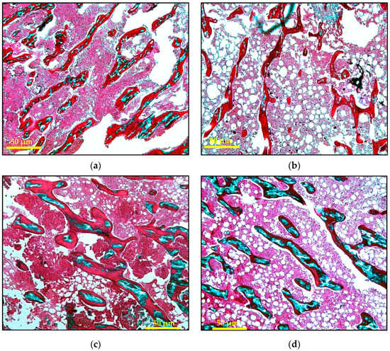 The static histomorphometry parameters were performed on decalcified bone samples stained with Masson–Goldner Trichrome showing green coloured mineralised bone and dark red coloured osteoid (Figure 2). Osteoblast and osteoclast cells could be clearly seen. Osteoblast cells have a single nucleus with a cytoplasm rich in organelles. They form a line on the surface of the osteoid. Osteoclast cells are multinucleated large cells with eosinophilic cytoplasm that are found close to the Howship’s lacunae. The parameters obtained were trabecular bone volume (BV), trabecular bone surface (BS), osteoid volume (OV/BV), osteoid surface (OS/BS), osteoblast surface (Ob.S), and osteoclast surface (Oc/S). The calculation of these parameters was done manually based on the modified Weibel technique [49].