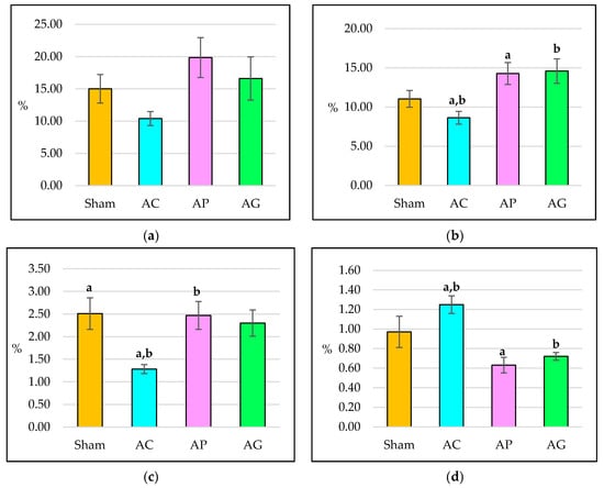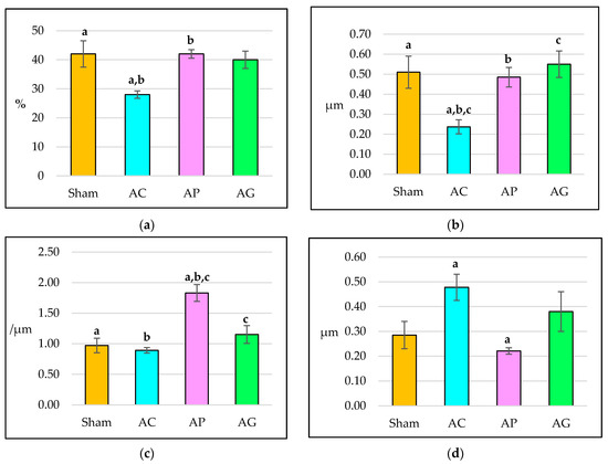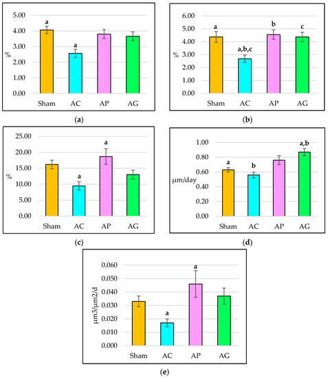 The mineral apposition rate in the AC was not significantly different compared to the Sham. MAR in the AG was significantly higher compared with Sham and AC. AP did not differ significantly compared to Sham and AC (Figure 6d).