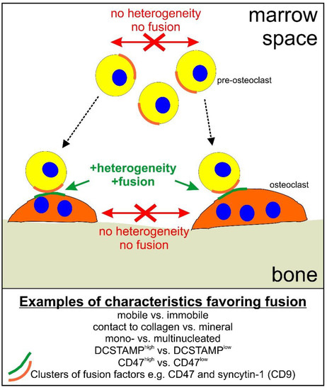 When considering all of these, primarily in-vitro-obtained, data, with respect to the importance of heterogeneity (Figure 1), it is important to bear in mind the physiological perspective with respect to regulating osteoclast fusion in vivo. As mentioned, the initial pre-osteoclast arriving on the mineralized bone surface encounters a different microenvironment to that of the pre-osteoclasts that migrate directly from the bone marrow to fuse. This will result in a different expression profile [10], and thus a heterogeneity, which, based on the results discussed above, will disfavor fusion between osteoclasts and pre-osteoclasts on the bone surface, but will instead favor fusion with pre-osteoclasts arriving from the bone marrow. This will also require that the cells relocate their fusion-related factors in a polarized clustered fashion, which may involve factors such as syncytin-1, CD47, and CD9. Thus, as shown in Figure 1, it does seem plausible that a way to ensure a physiological and controlled fusion in vivo, is through the heterogeneity of fusion partners.