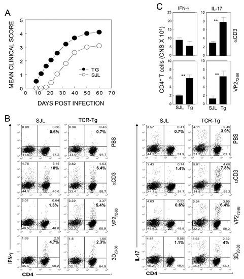 2.1. Comparison of the Development of Demyelinating Disease and CD4+ T Cell Responses in SJL and VP2-TCR-Tg Mice after TMEV Infection