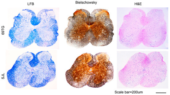 Mice were perfused via cardiac puncture with 50 mL of PBS at 65 days postinfection with TMEV. Spinal cords from the TCR-Tg and control SJL mice were fixed in 4% formalin in PBS for 24 h and embedded in OCT. The spinal cords were sectioned at 6 μm and stained with hematoxylin and eosin (H&E) for inflammatory infiltrates, Luxol Fast Blue (LFB) for axonal demyelination, and Bielschowsky silver staining for axon loss and damage. Four different sections of the lumbar region of the spinal cords per experimental group were examined using a Leica DMR fluorescent microscope. The images were captured using an AxioCam MRc camera with the AxioVision imaging software (Göttingen, Germany).