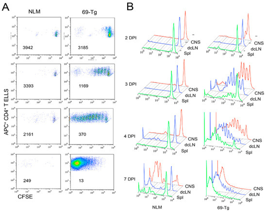 To further assess the activation patterns of naive CD4+ T cells specific for a viral determinant after TMEV infection, purified naive VP2-TCR-Tg CD4+ T cells were labeled with CFSE and then adoptively transferred into normal SJL mice. The pattern of proliferation of the CFSE-labeled VP2-TCR-Tg CD4+ T cells was compared to that of the control CD4+ T cells lacking reactivity to the viral determinant at 2, 3, 4, and 7 days postinfection (Figure 4). The proliferation of virus-reactive CD4+ T cells was detectable in the CNS as early as 2 dpi, and progressively increased at 3 and 4 dpi, whereas no detectable proliferation was observed in the recipients with the control CD4+ T cells (Figure 4A). By 7 dpi, the majority of the VP2-reactive CD4+ T cells proliferated for several generations compared to the low divisions of normal CD4+ T cells. We further compared the patterns of VP2-reactive CD4+ T cell proliferation in the CNS, the deep cervical lymph nodes (dcLN), and the spleens at 2, 3, 4, and 7 dpi (Figure 4B). At 2 dpi, the VP2-reactive CD4+ T cells began to proliferate in the CNS and then dcLN, with hardly any in the spleen. However, at 3 dpi, vigorous proliferations for several generations were seen in the CNS and dcLN, and proliferation was also detectable in the spleen. The rate of proliferation appeared to increase in the dcLN and spleen at 4 dpi, while the rate slowed down in the CNS. The proliferation reached its maximum (>10 divisions) by 7 dpi in all organs. Taken together, these results strongly suggest that virus-reactive CD4+ T cells initially differentiated and expanded in the CNS and dcLN where viral antigens are readily available.