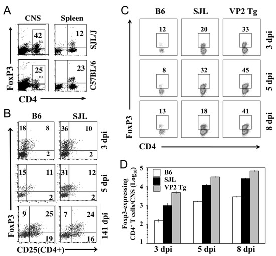 Because FoxP3+CD4+ T cells are known to regulate virus-specific T cell responses [14], we also assessed the levels of FoxP3+CD4+ T cells in the CNS of TMEV-infected mice (Figure 5). First, we compared the levels of FoxP3+CD4+ T cells in the CNS and spleens between susceptible SJL and resistant B6 mice after TMEV infection at 5 dpi (Figure 5A). Susceptible SJL mice showed a higher level of FoxP3+CD4+ T cells in the CNS compared to that in the resistant B6 mice. However, resistant B6 showed no differences in the proportions of FoxP3+CD4+ T cells between the CNS and spleen. Conversely, a three-fold higher proportion of FoxP3+CD4+ T cells was found in the CNS of susceptible SJL mice compared to that in the spleen. As early as 3 dpi, FoxP3+CD4+ T cells were found in the CNS of both the TMEV-infected B6 and SJL mice (Figure 5B). Interestingly, the CNS of the SJL mice at 3 and 5 dpi displayed as much as two-fold higher proportions of FoxP3+CD4+ T cells with CD25−, suggesting that FoxP3+CD4+ T cells in the CNS of virus-infected SJL mice may represent undifferentiated regulatory T cells [27]. However, the proportions of CD25hiFoxP3+CD4+ T cells, which represent activated regulatory T cells, were similar between the B6 and SJL mice. When FoxP3+CD4+ T cells in the CNS of TMEV-infected VP2-TCR-Tg mice were compared with the B6 and SJL mice (Figure 5C), the proportions of FoxP3+CD4+ T cells in the CNS of the VP2-TCR-Tg mice were shown to be even higher and persisted in the CNS even at 8 dpi compared to those of the SJL mice. The differences among these mouse groups appear to reflect the relative frequencies of virus-specific FoxP3+CD4+ T cells. The overall numbers of FoxP3+CD4+ T cells rapidly and proportionally (10–20 fold) increased from 3 dpi to 8 dpi in the CNS of all different mouse groups (Figure 5D). Thus, the potential function of virus-specific FoxP3+CD4+ T cells accumulated in the CNS of susceptible mice early after TMEV infection may contribute to the pathogenesis of TMEV-induced demyelinating disease.